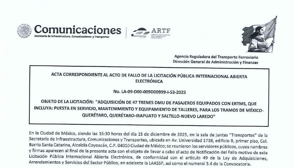 La Agencia Reguladora del Transporte Ferroviario (ARTF) otorgó a Alstom Ferroviaria México S.A. de C.V. el contrato para la compra de 47 trenes DMU equipados con ERTMS, destinados a las rutas México–Querétaro, Querétaro–Irapuato y Saltillo–Nuevo Laredo.
