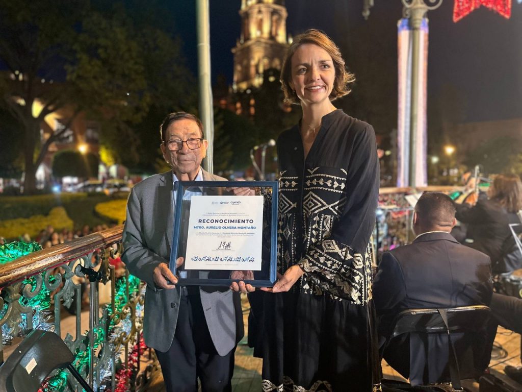 Durante la celebración, la funcionaria otorgó un reconocimiento como Director Emérito al maestro Aurelio Olvera Montaño, quien dirigió la agrupación durante casi 54 años, desde 1970 hasta 2024.