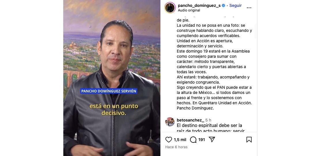 Domínguez afirmó que el PAN se encuentra en un “punto decisivo” y solicitó construir la unidad “hablando claro, escuchando y cumpliendo acuerdos verificables”. Su mensaje incluyó una reflexión sobre su trayectoria en el partido desde 1992, el cual describió como su “casa de convicciones claras y palabra cumplida”.
